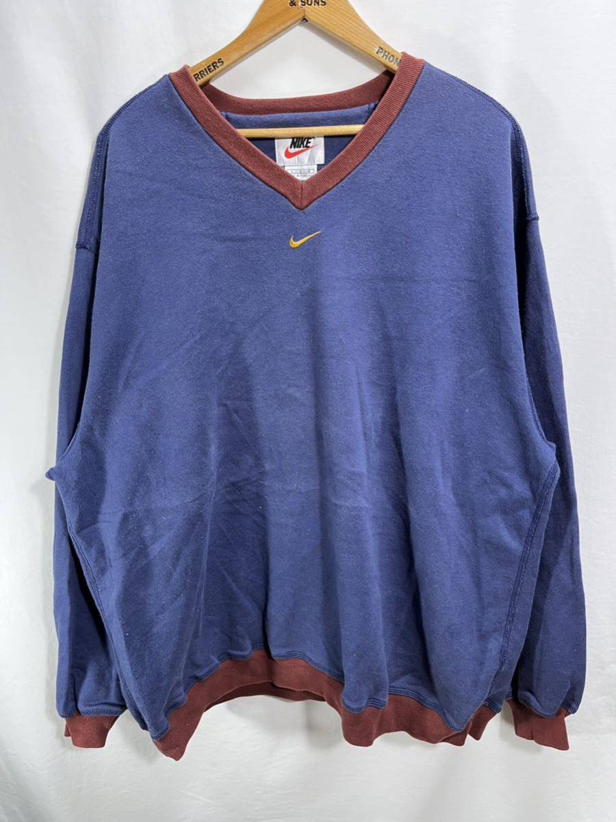 > ■ 90s ビンテージ NIKE ナイキ センタースウォッシュ 刺繍ロゴ 2トーン Vネック スウェット トレーナー サイズL アメカジ ■