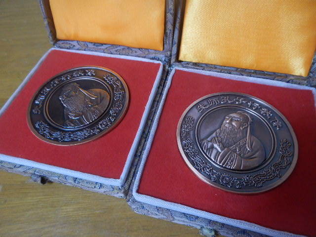 - レトロ 中国土産 曲阜 孔子廟 【孔子 メダル】 2個 セット アンティーク コイン まとめて ケース入 金属製 珍品 コレクション 当時物 兼用