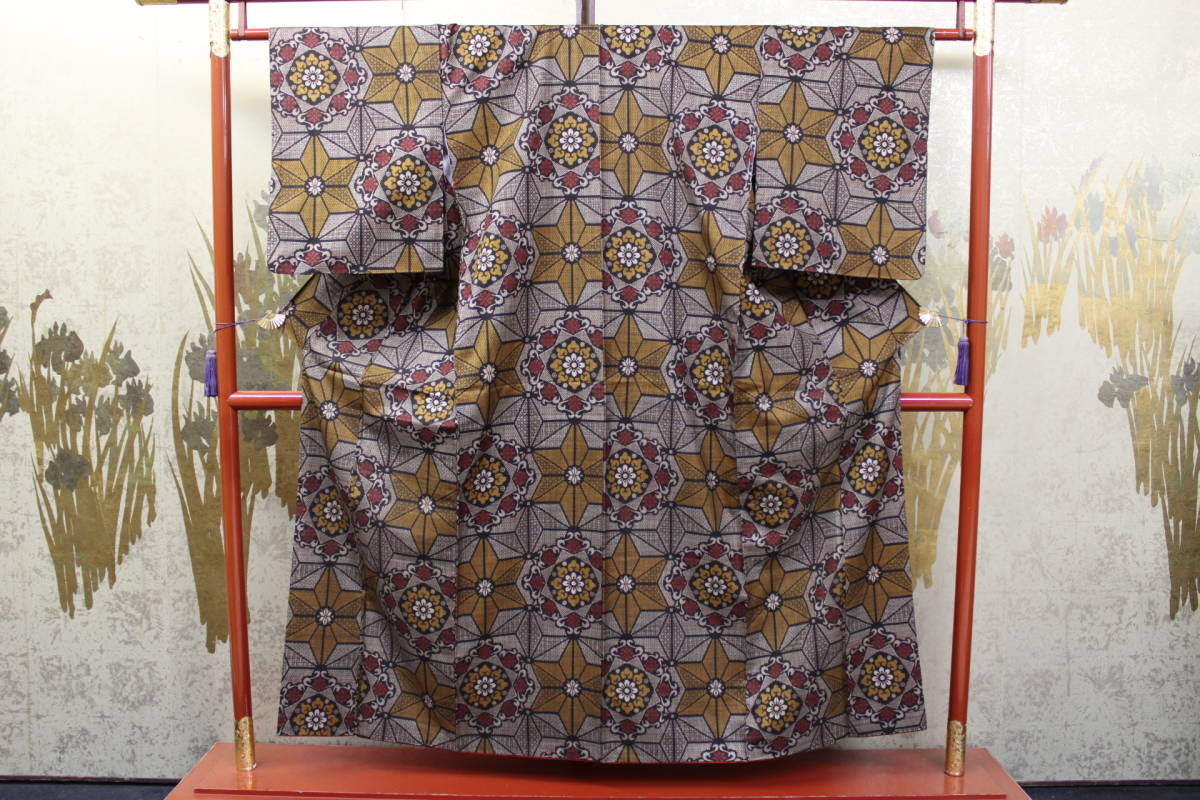 > きもの今昔5089 本場大島紬 竜郷大島調 合繊バチ衿袷手縫い仕立てきもの 色使いが素晴らしい 身丈147cm
