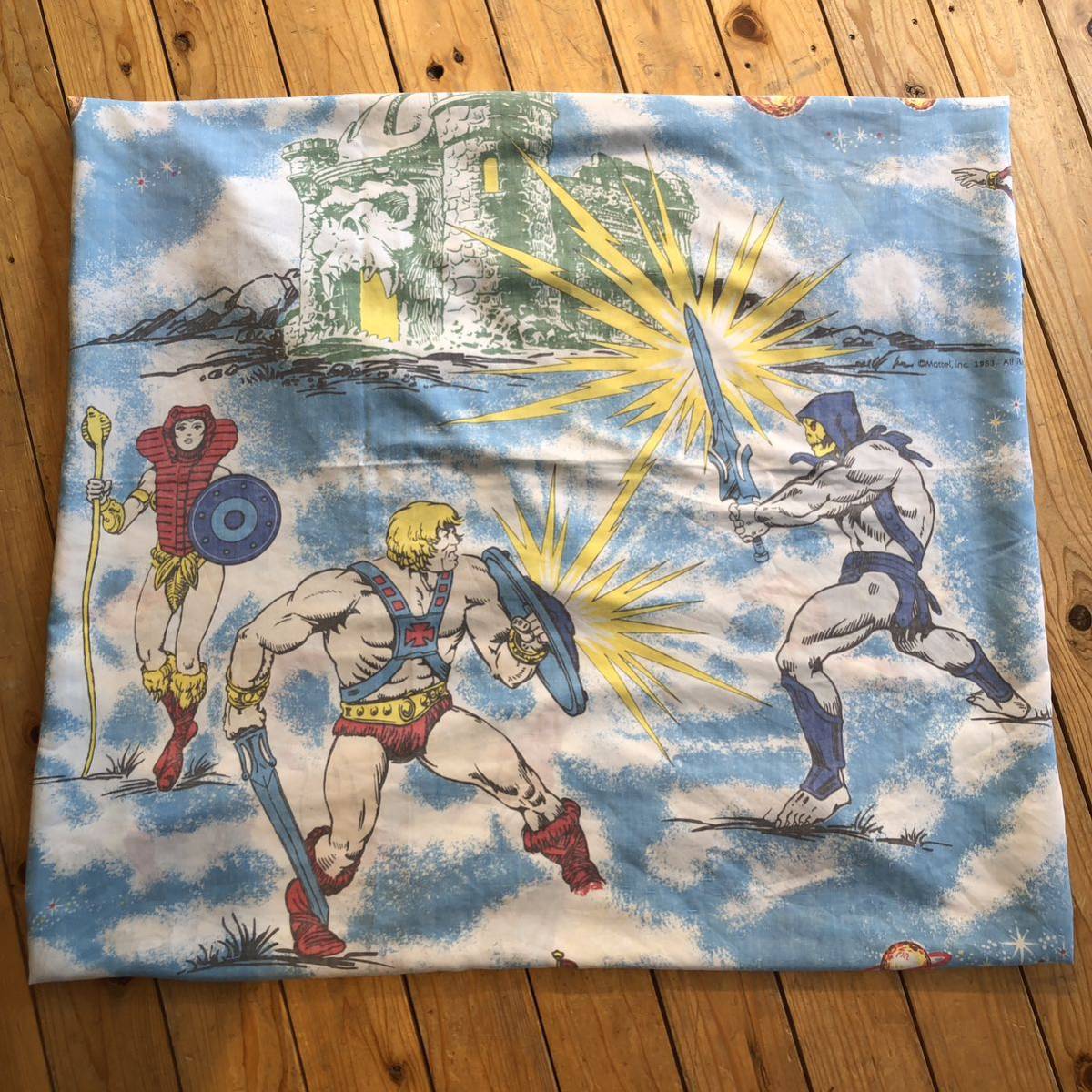 - USAヴィンテージ ベッドシーツ リメイク生地 素材 フラットシーツ マスターオブザユニバース ヒーマン アメコミ アメリカ仕入 総柄 B1352