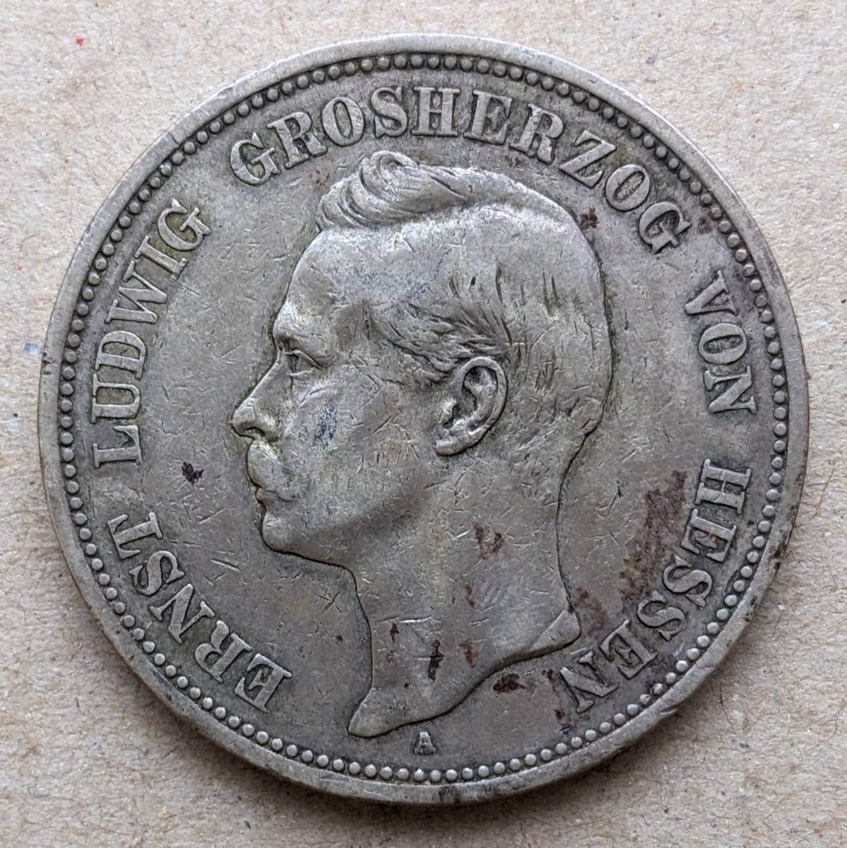 - 1899年 ドイツ ヘッセン ダルムシュタット 5マルク 銀貨 VF ベルリンミント