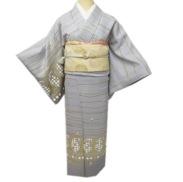 > ★きもの北條★ 特選 横縞に花の図 個性豊かな装いに 薄灰色 金 着物 訪問着 A779-2 M【中古】