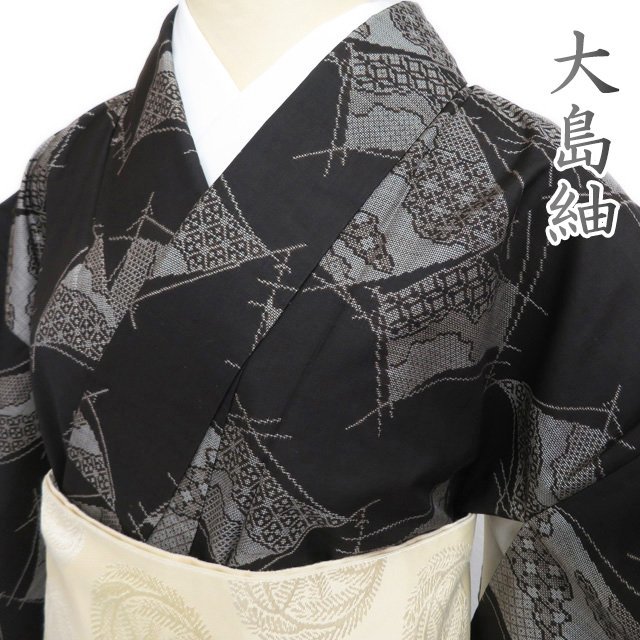 > ★きもの北條★ 大島紬 9マルキ モダンでカジュアルな装いに 黒色 焦茶色 着物 A783-5 SA 【中古】