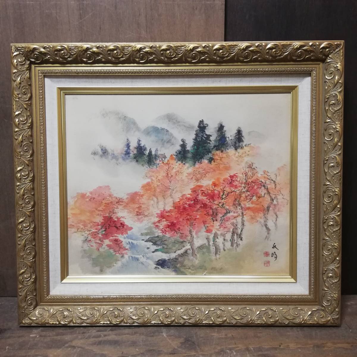 - 作者不明 絹本 山水画 額装 肉筆 68cm×59cm 木製 ゴールドフレーム