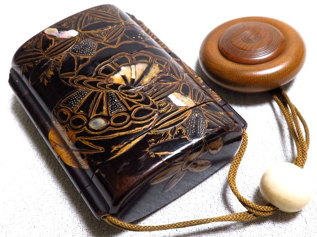 - 印籠 螺鈿細工 蒔絵 緒締め 鏡蓋根付 時代提げ物