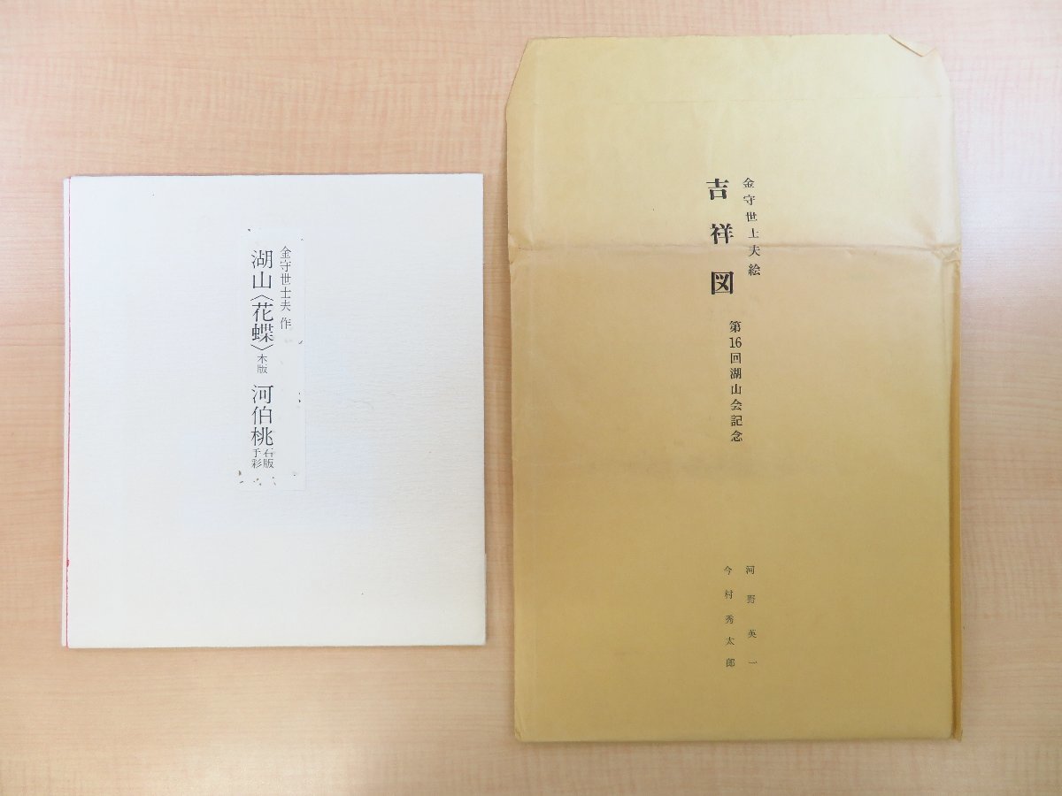 - 金守世士夫 オリジナル版画3枚「吉祥図」(手彩色木版画)「湖山<花鳥>」(彩色木版画)「河伯桃」(手彩色石版画)