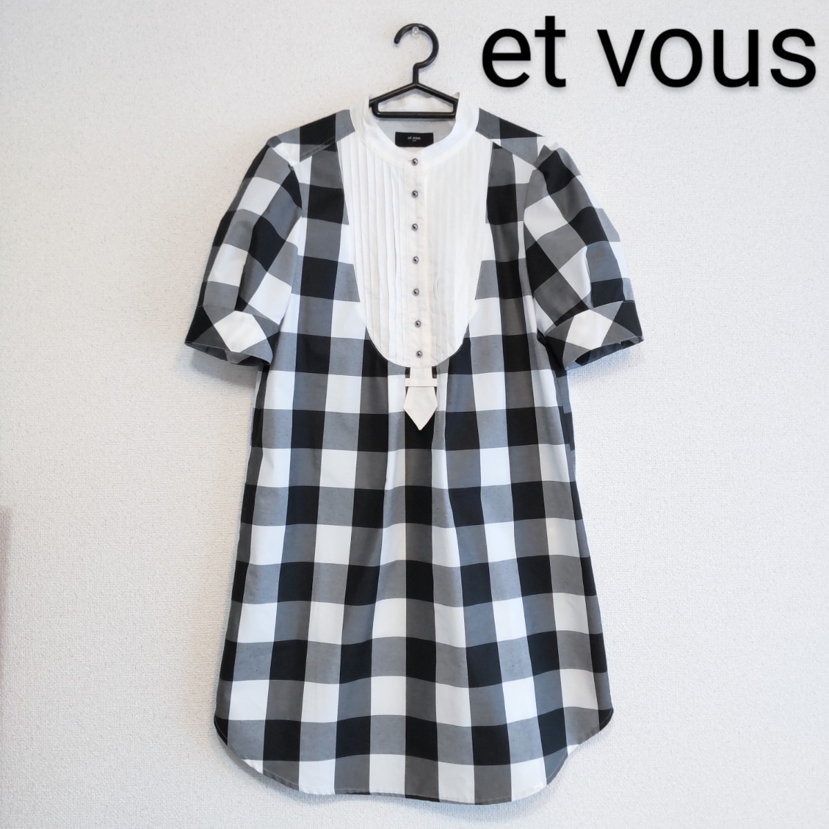 - et vous エヴー エブー カットソー チュニック ブラウス シャツ ミニワンピース 半袖 モノトーン 黒白 ギンガム チェック スタンドカラー