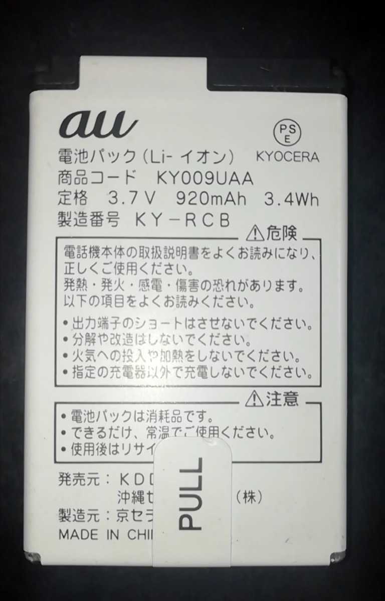 - 【中古】au純正KY009UAA電池パックバッテリー【充電確認済】対応機種(参考)K009