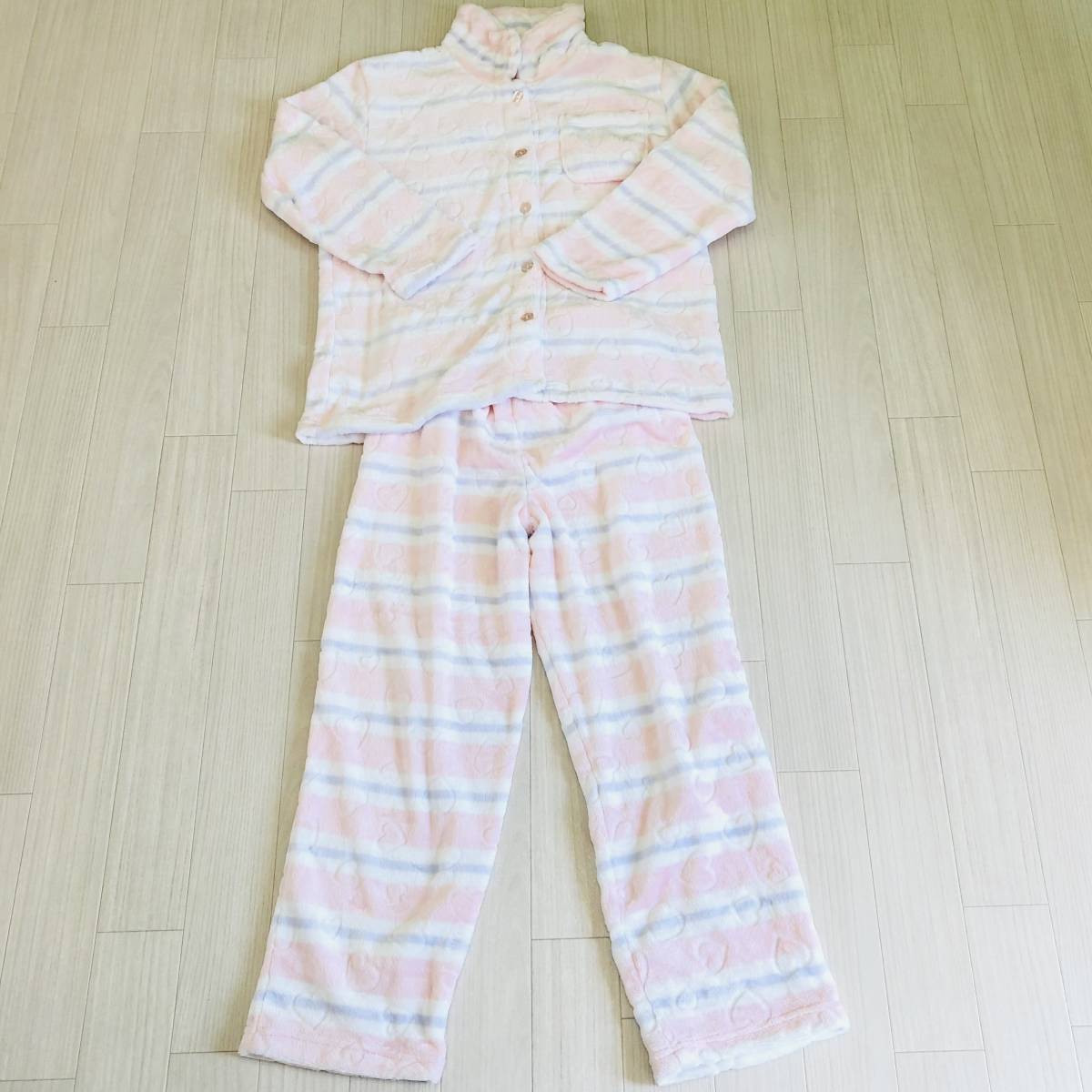 > AS0297 美品 suurire スリール レディース 上下セット パジャマ ルームウェア 部屋着 M ボーダー ゆるふわ ハート ゆめかわ 白 ピンク 紫