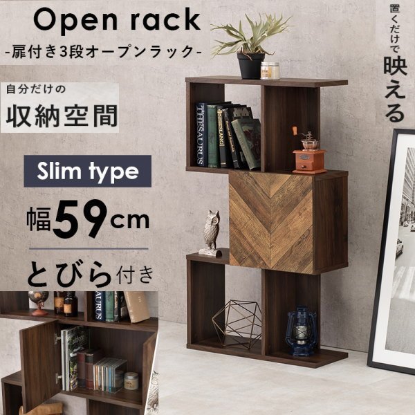 - RCC-1014BR 扉付 3段オープンラック 横幅59cm ブラウン BR 置くだけで映える 間仕切り A4サイズ対応 横向き置ける 送料無料