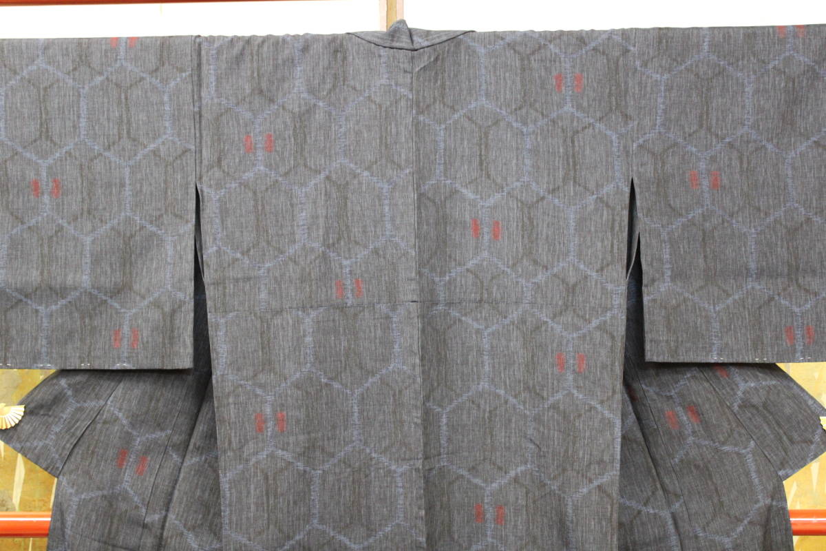 > きもの今昔5513 単衣のきもの サマーウール 広衿セブセ付き仕立 黒地に紺色の絣 大きい亀甲繋の柄 身丈149cm