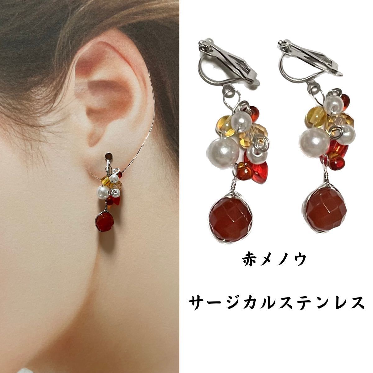 - イ44. 天然石 イヤリング 赤メノウ オリジナルデザイン メノウ アゲート サージカルステンレス アレルギーフリー ニッケルフリー