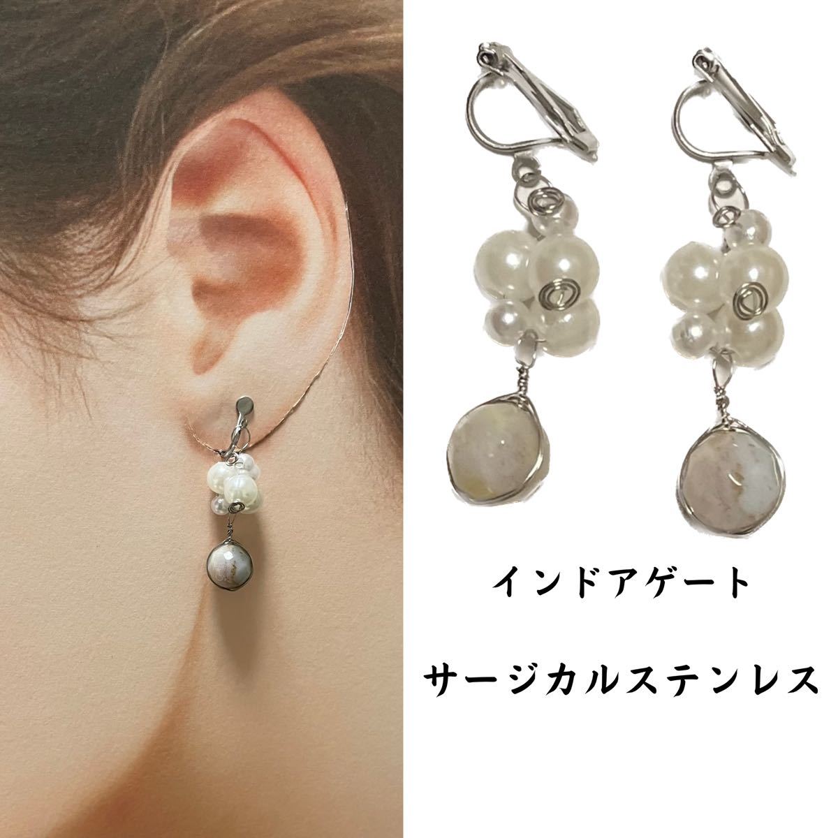 - イ23. 天然石 イヤリング インドアゲート オリジナルデザイン メノウ アゲート サージカルステンレス アレルギーフリー ニッケルフリー