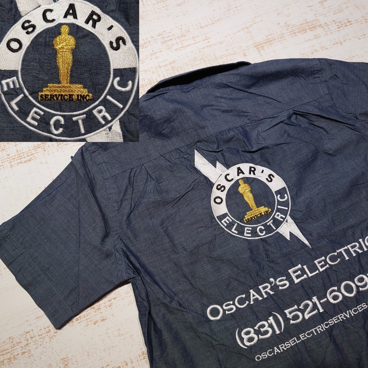 - A868 VAN HEUSEN ワーク シャツ 半袖 アメリカ 古着 M OSCAR'S バック 刺繍 フロント 前後 オスカー エレクトリック サービス ユニフォーム