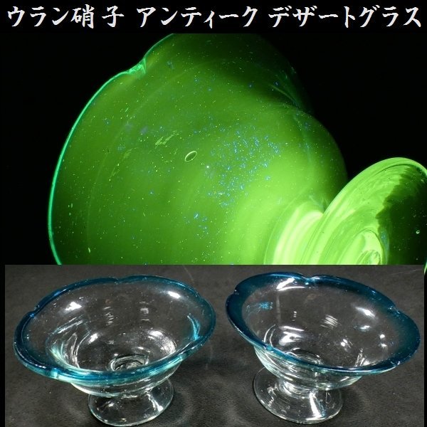 > 【 恵 #0761 】 ウラン硝子使用 アンティーク 輪花型 水色硝子 氷コップ デザートグラス 2点 ① 検:鉢/古ガラス/氷コップ/色ガラス/硝子