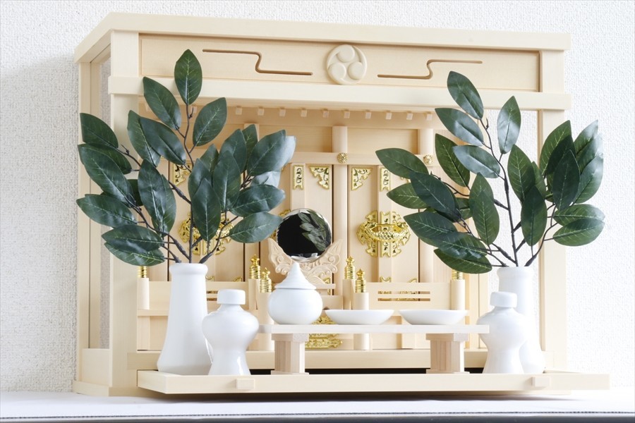 - 神棚セット 箱宮三社 16号 飾り欄間 巴紋 引出し付 三面ガラス 神具付