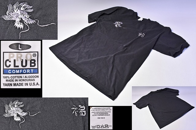 - スカジャン風 刺繍 半袖 Tシャツ ★ Lサイズ 黒 ★ PRO CLUB BODY ★ 龍 福 刺繍 グレー ★