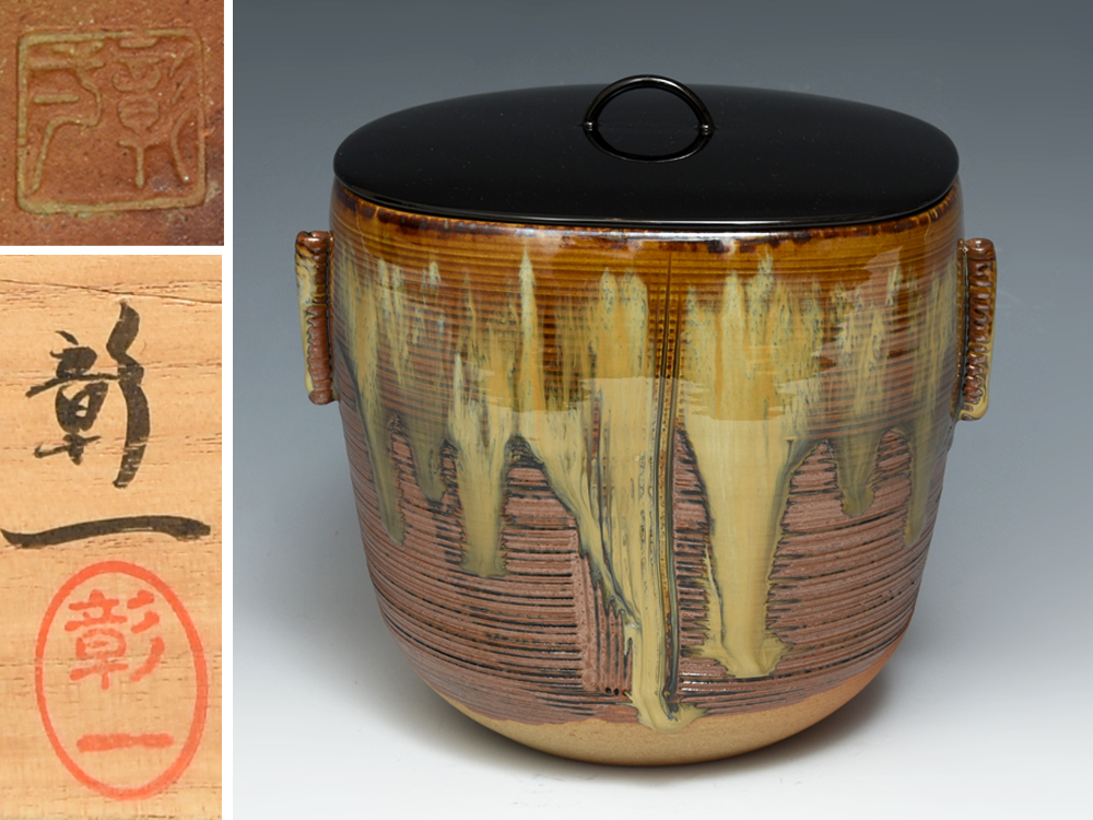 - 高取焼 元永彰一 (造) 管耳 水指 高:16.6㎝ 誂え蓋付 共箱 茶道具 陶磁器 z5600t