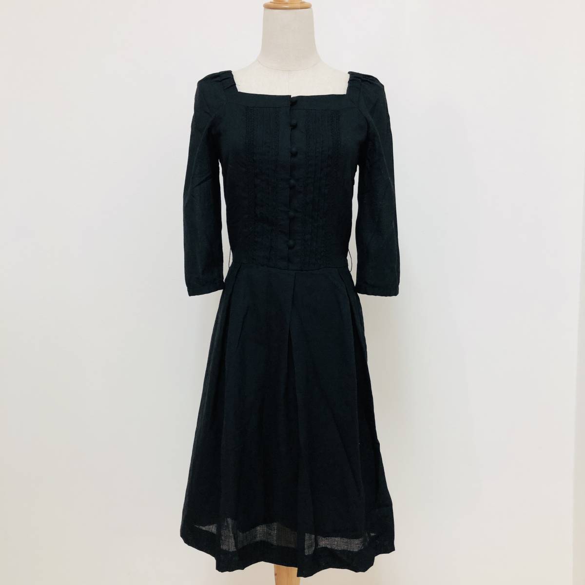 > k0898 ROPE ロペ ワンピース 七分袖 スクエアネック 薄手 裏地 ファスナー 9号 黒 毛混 レディース 高級感 上品 エレガントガーリーチック