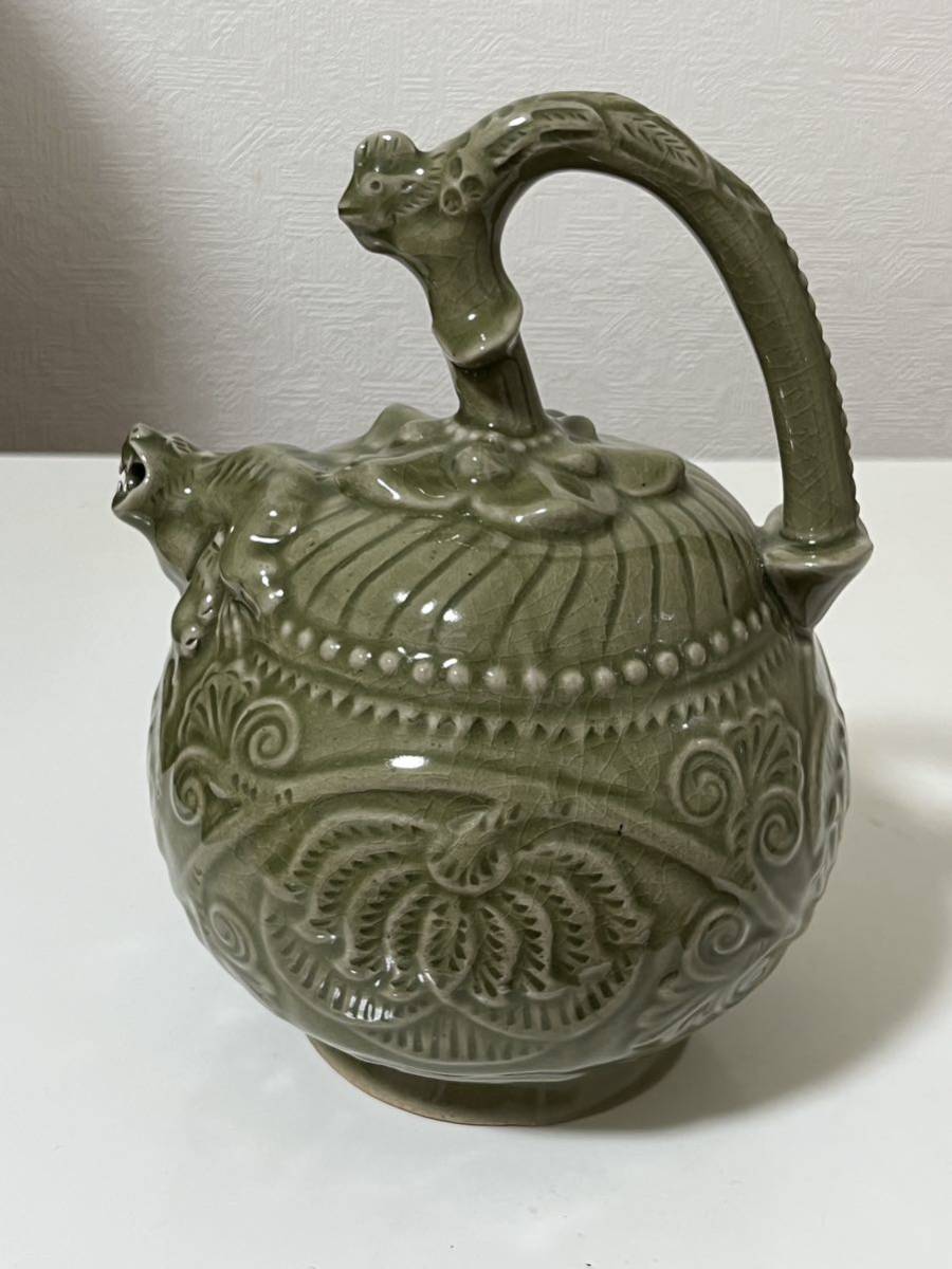 - 中国美術 宋 耀州窯青釉 浮雕 纏枝花卉流三足倒流提急須