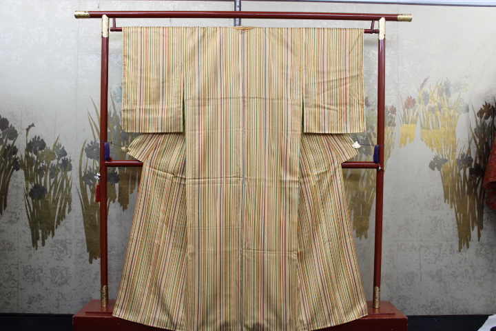 - きもの今昔5856 小紋のきもの 正絹綸子地クリーム地入りに画像⑧綺麗目の縞柄 シツケ糸付き未使用品 身丈156cm