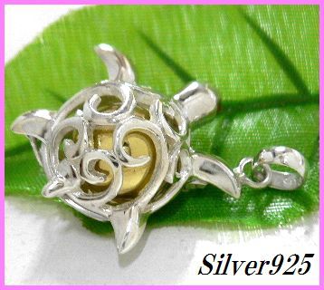 - シルバー925銀のウミガメ[ホヌ]バスケット ガムランボール ペンダント/シンセティックルビー付
