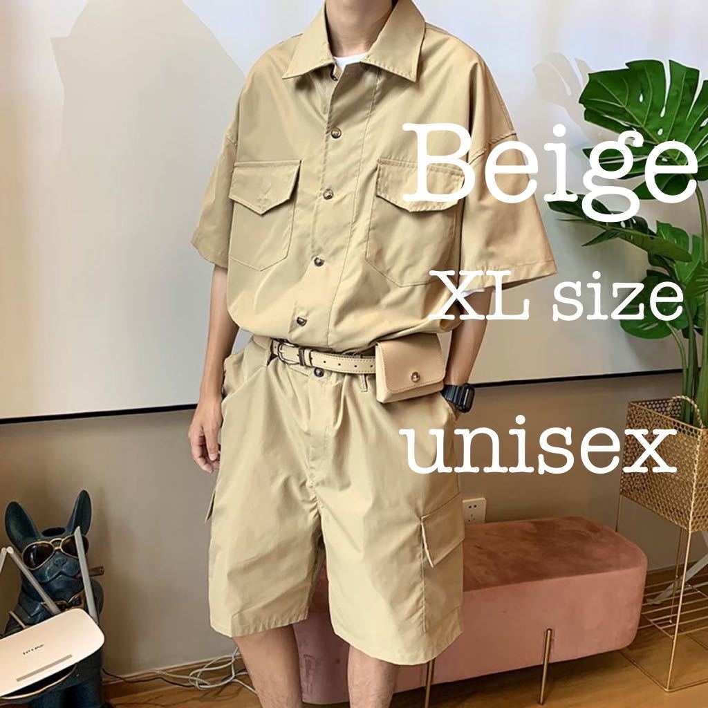 - セットアップ つなぎ 作業着 サロペット オーバーオール オールインワン アウトドア 部屋着 ポーチ 半袖 短パン ユニセックス ベージュ XL
