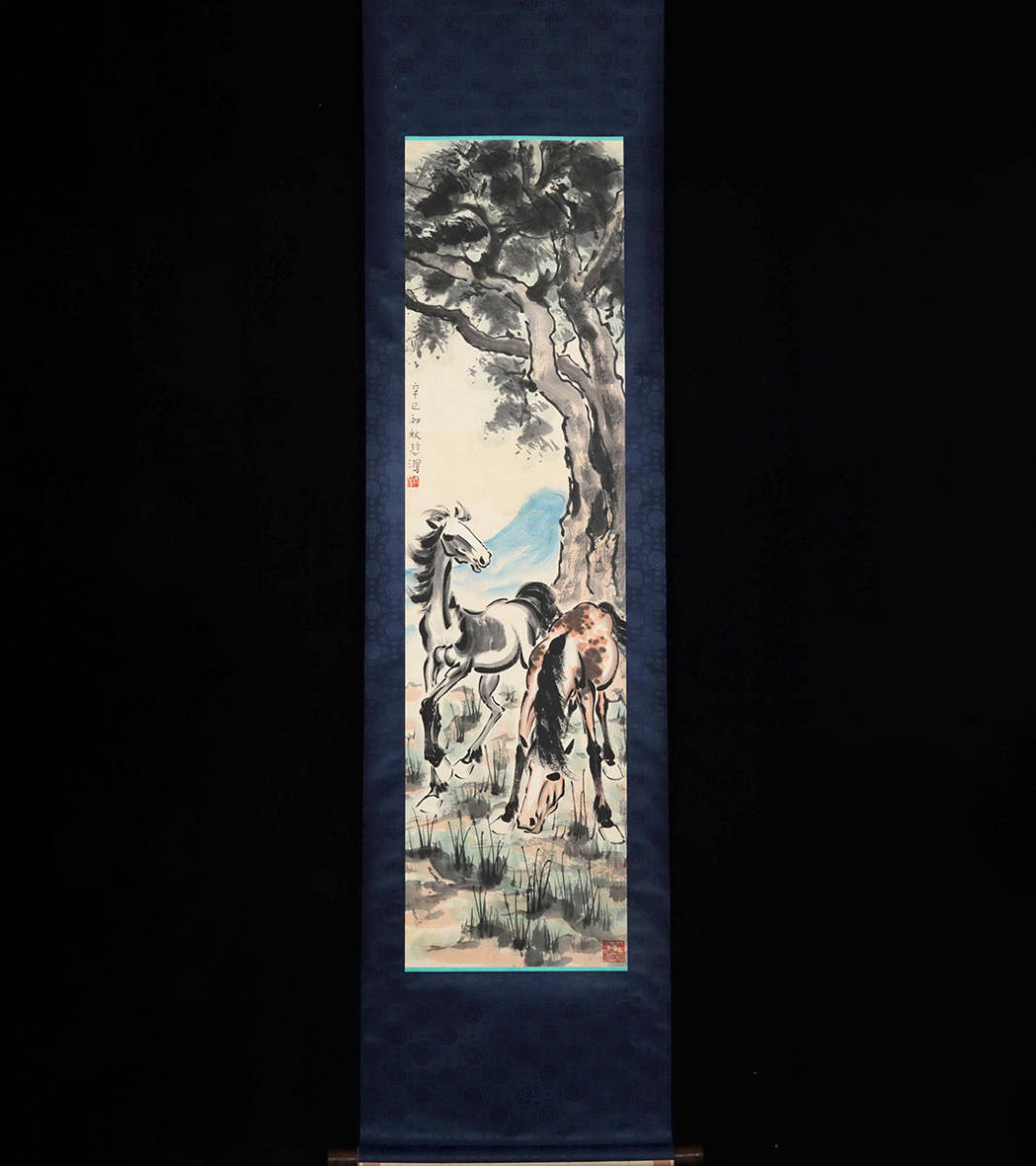 - 古美術 掛け軸 中国・近現代 徐悲鴻書 「榕樹双駿図」 紙本 立軸 書道 巻き物 真筆逸品 肉筆保証 唐物 古画 LT-1001