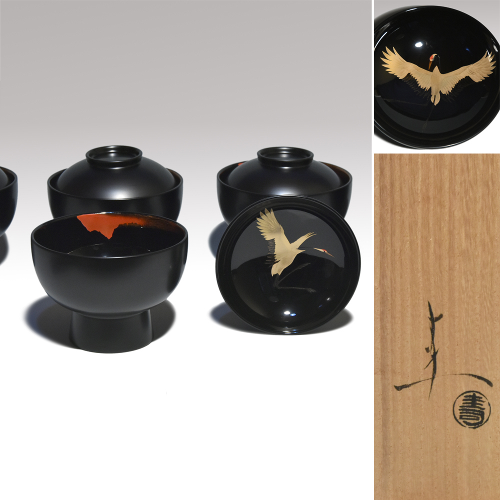 - 漆芸家 岸本圭司(造)蒔絵椀「舞」5客 共箱 未使用 茶道具 懐石道具 茶懐石 懐石料理 天然木 漆工芸 漆芸 木工芸 y2394