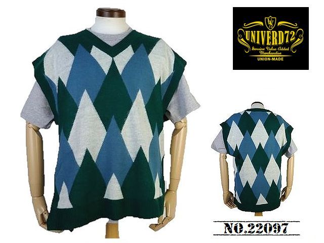 > 【送料無料 69%OFF】UNIVERD72 ユニバード72 BRUSHING アーガイル柄 表起毛 ベスト NO.22097 GREEN_Lサイズ