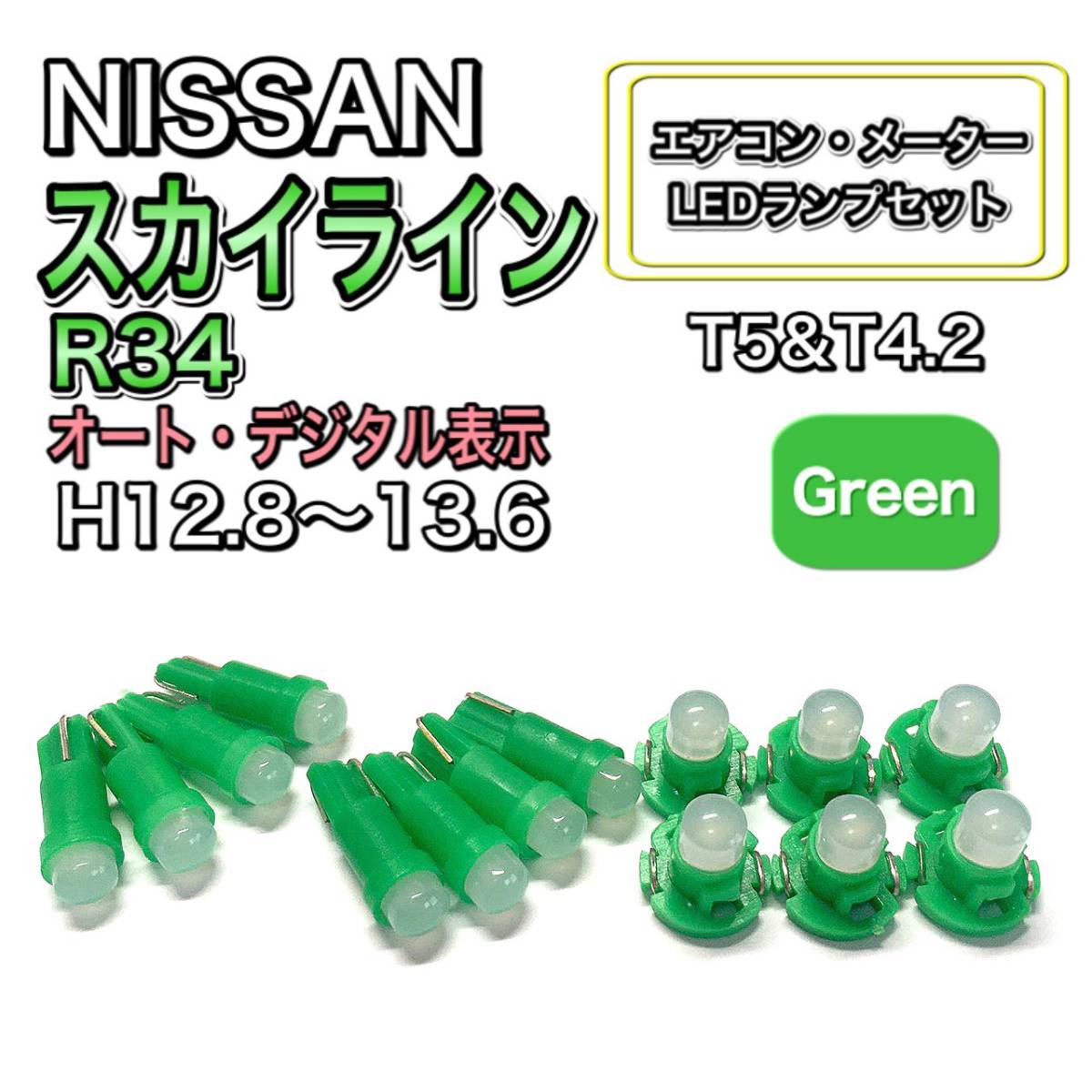 > スカイライン R34 H12.8~H13.6 打ち換え LED エアコン・メーターランプ T4.7T5 T4.2 T3 ウェッジ 日産 グリーン