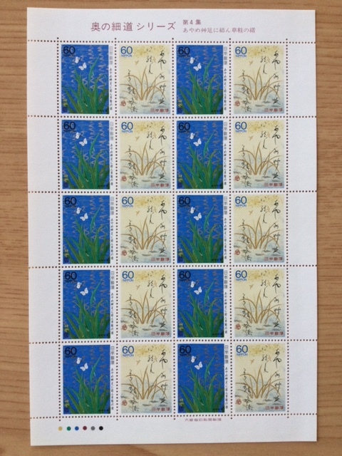 > 奥の細道シリーズ 第4集 あやめ艸 足に結ん 草鞋の緒 あやめ草・句の書 1シート(20面) 切手 未使用 1988年