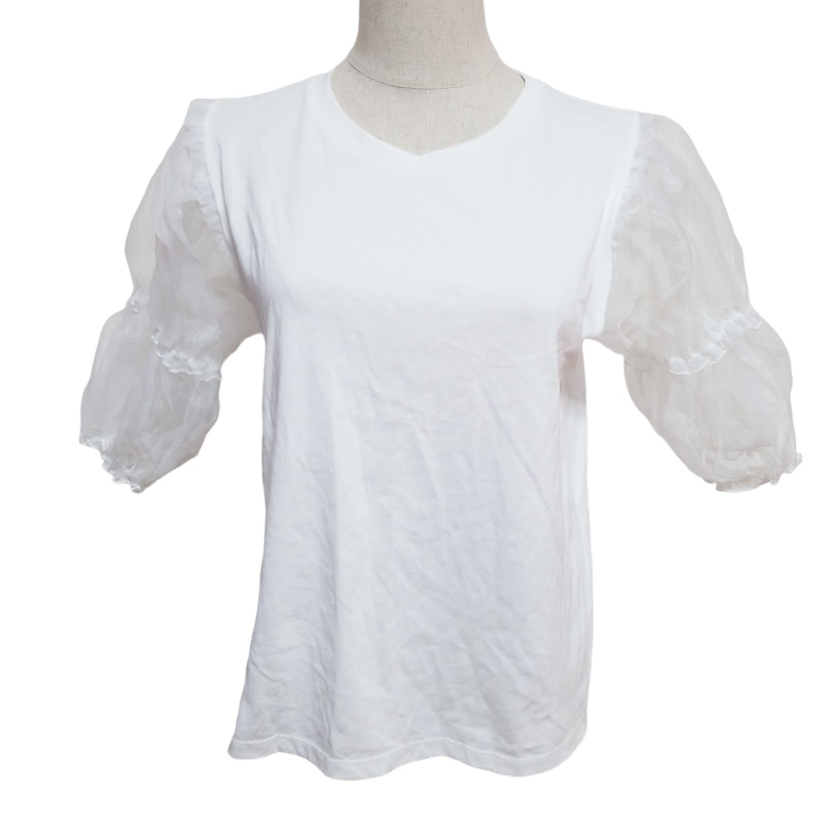 > Y1012 ZARA ザラ 異素材ドッキング カットソー トップス チュール袖 シアー袖 クルーネック レディース M ホワイト 白 個性的