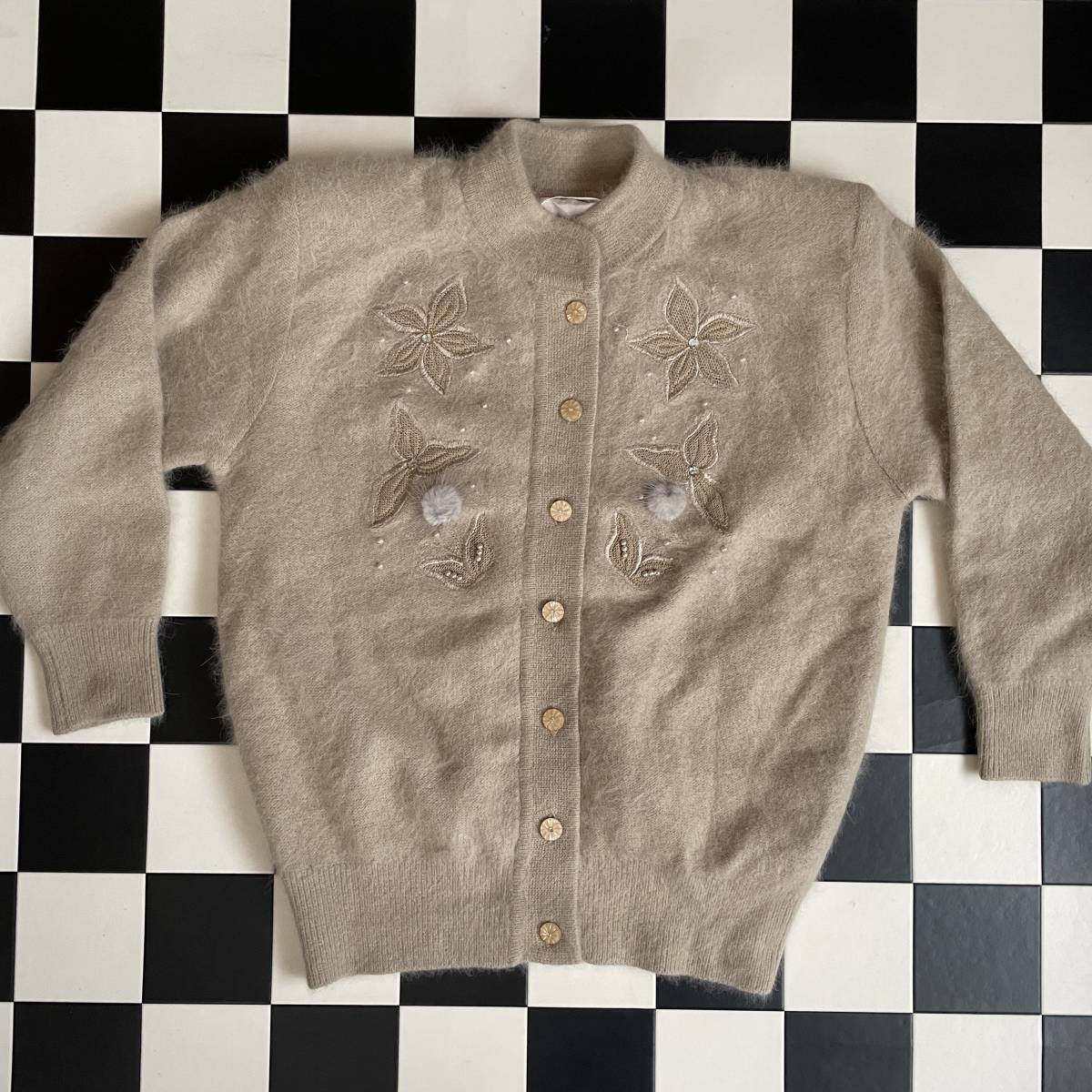 - 里麻 ニットカーディガン 花柄刺繍 毛皮ボンボン ビーズ使い Y5049 裏地あり ポケットなし ベージュ レターパックプラス