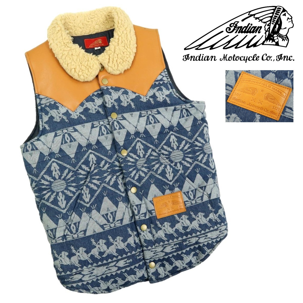 - 【B2690】【新品同様】INDIAN MOTORCYCLE インディアンモーターサイクル 中綿ベスト インディゴ レザー切替 サイズM
