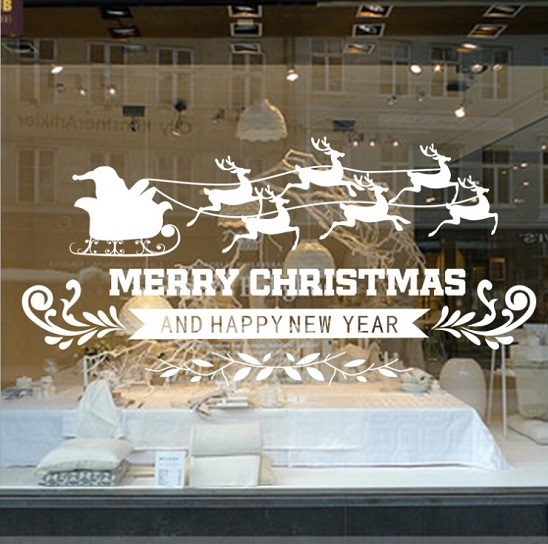 - ウォールステッカー クリスマス ソリに乗る サンタクロース シルエット 装飾フィルム シール トナカイ 英語 白色 窓ガラス 壁面 年末年始