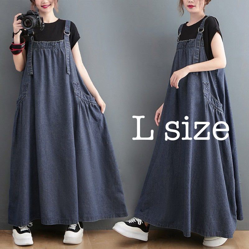 - ロングワンピース ワイド サロペット ロングスカート デニム ワンピース オーバーオール 体型カバー ネイビー L