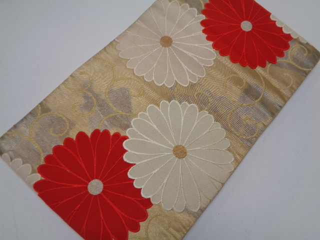 > d143-80 袋帯 正絹 しじら織り 六通柄 金銀糸 紅白菊花唐草文 昭和レトロ アンティーク