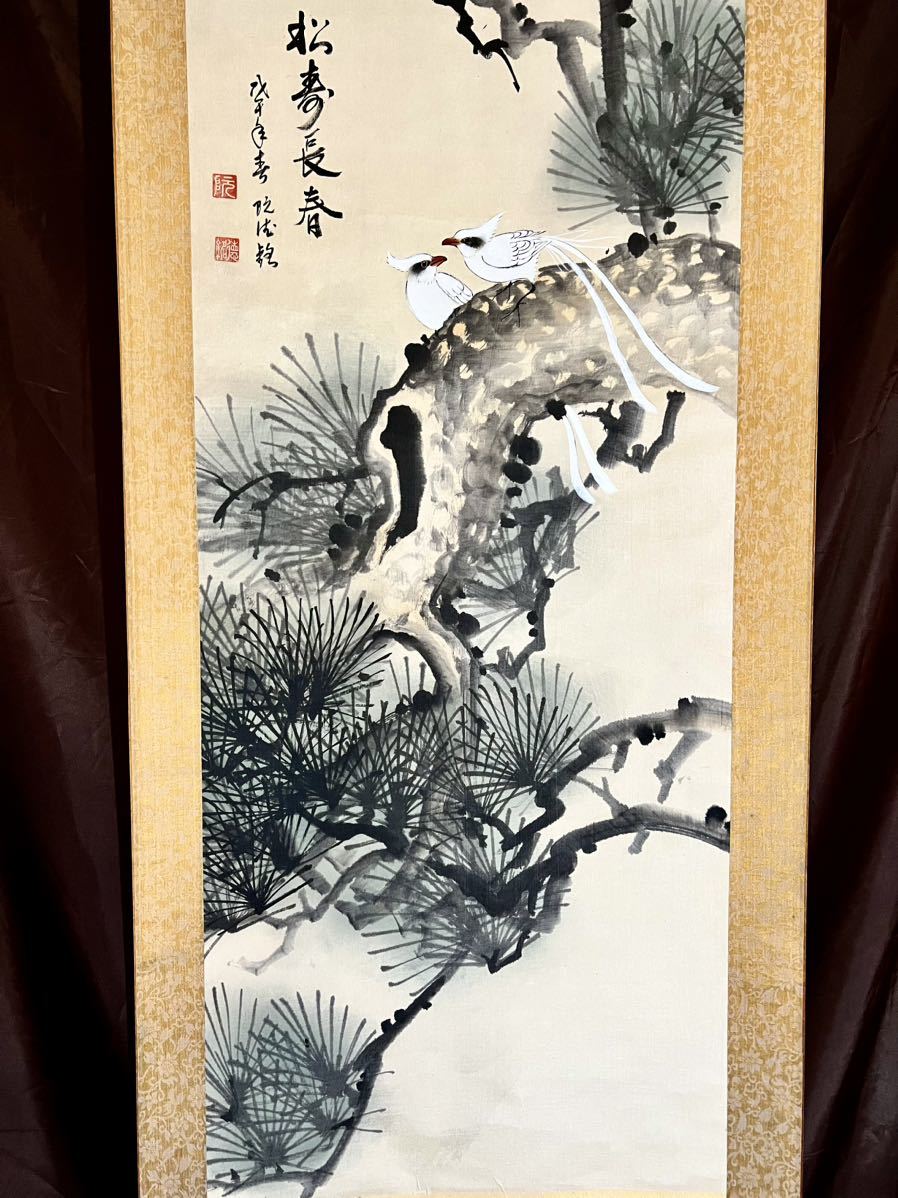 - [模写] [S8] 阮徳「松寿長春」絹本 大幅 花鳥図 鳥獣 尾長鶏 祝い飾り 絵画 掛軸 中国美術