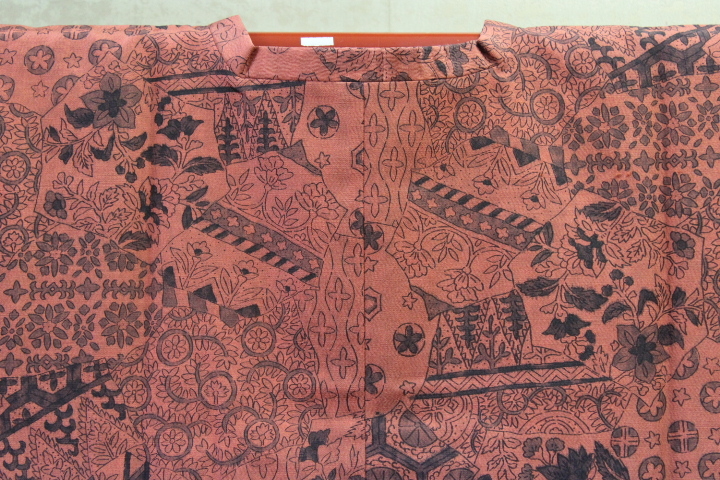 - きもの今昔6277 道行コートコレクション 正絹駒上代生地 煉瓦色地に墨色更紗柄 未使用に近い コート丈82cm
