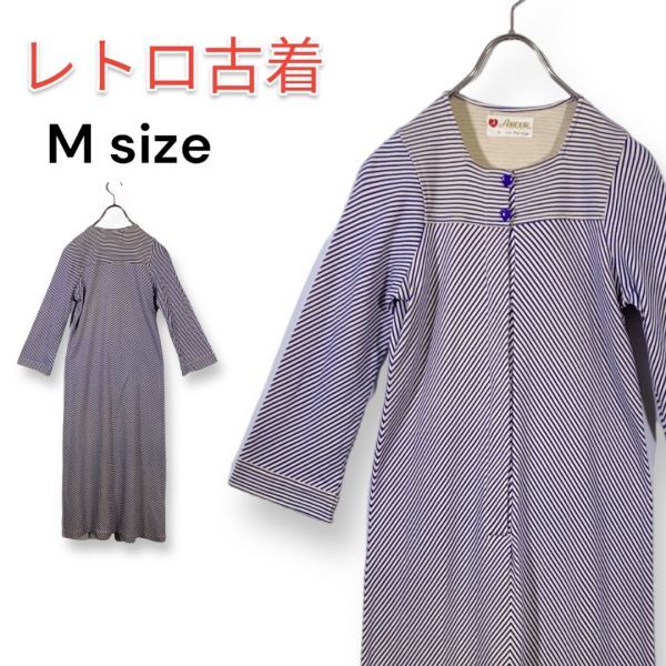 - 昭和レトロ ヴィンテージ vintage ナイトウェア ワンピース ルームウェア 部屋着 Mサイズ ストライプ 長袖 パジャマ AMOUR