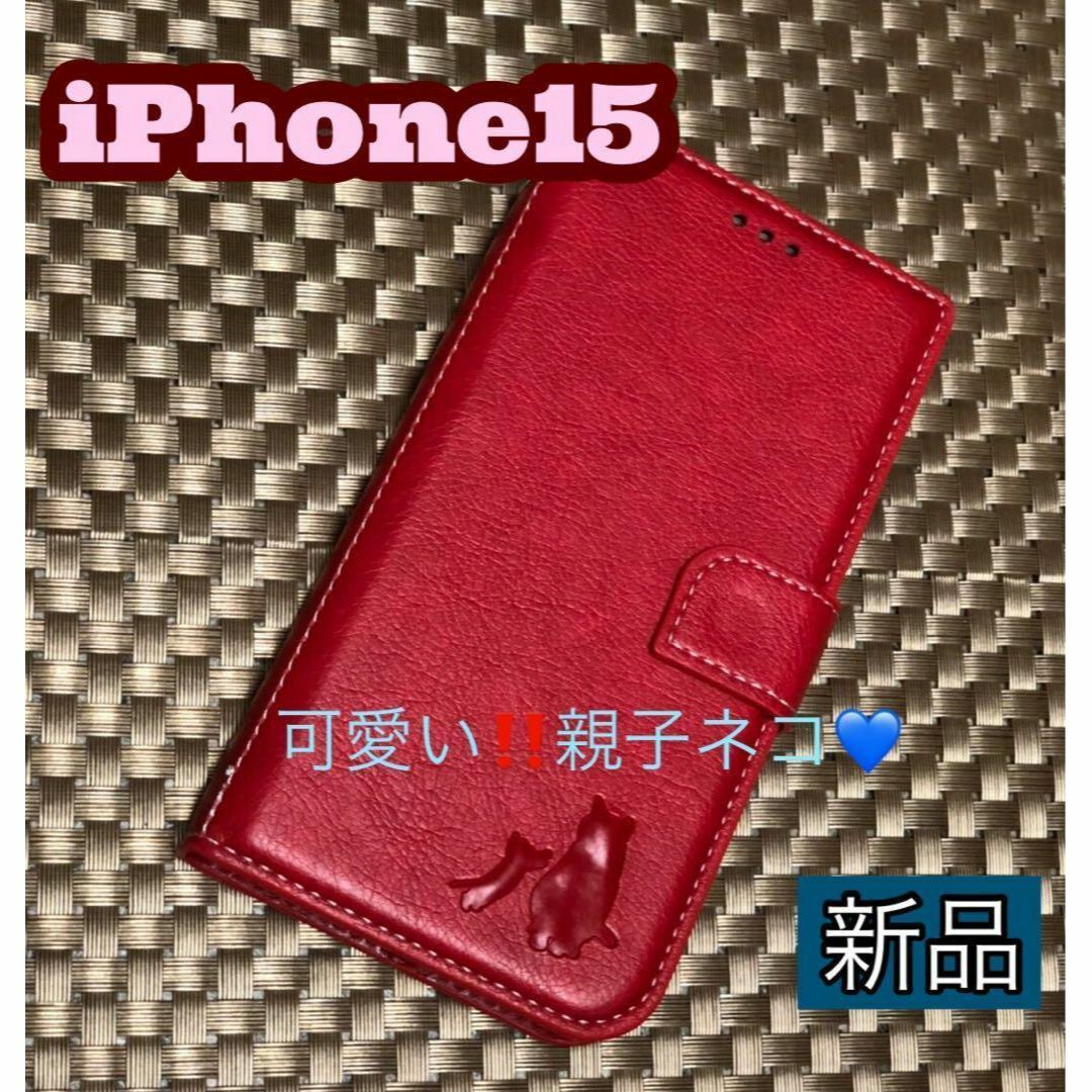 - iPhone15ケース 手帳型ケース レッド 親子ネコ刻印 新品 未使用