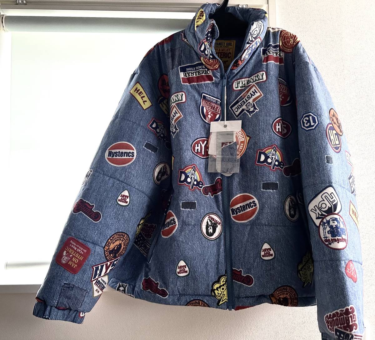 - ヒステリックグラマーPATCH SCRATCH FEVER柄 スタンドカラージャケット ロゴ総柄プリマロフト新品タグ付66000円 FREEオーバーサイズ