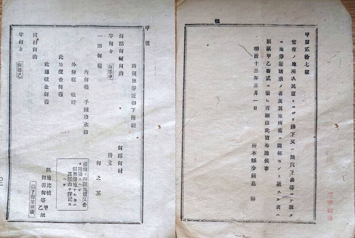 - f24012914〇明治布告布達 官有の地所 新規地券証御下附願 栃木県 明治13年〇和本古書古文書