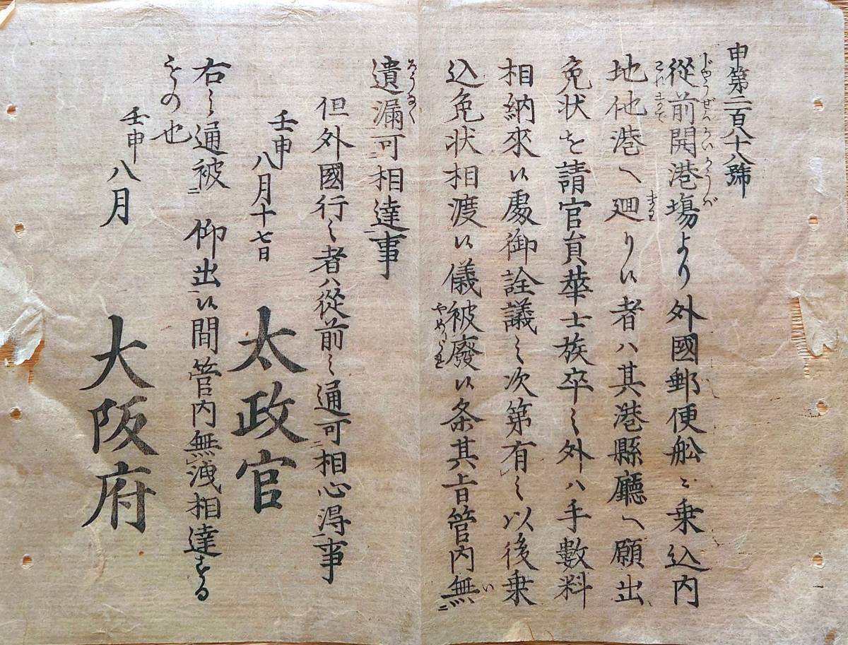 - f23030914〇明治布告布達 明治5年 開港場より外国郵便船に乗込 内地他港へ廻り候う者 免状必要 大阪府〇和本古書古文書