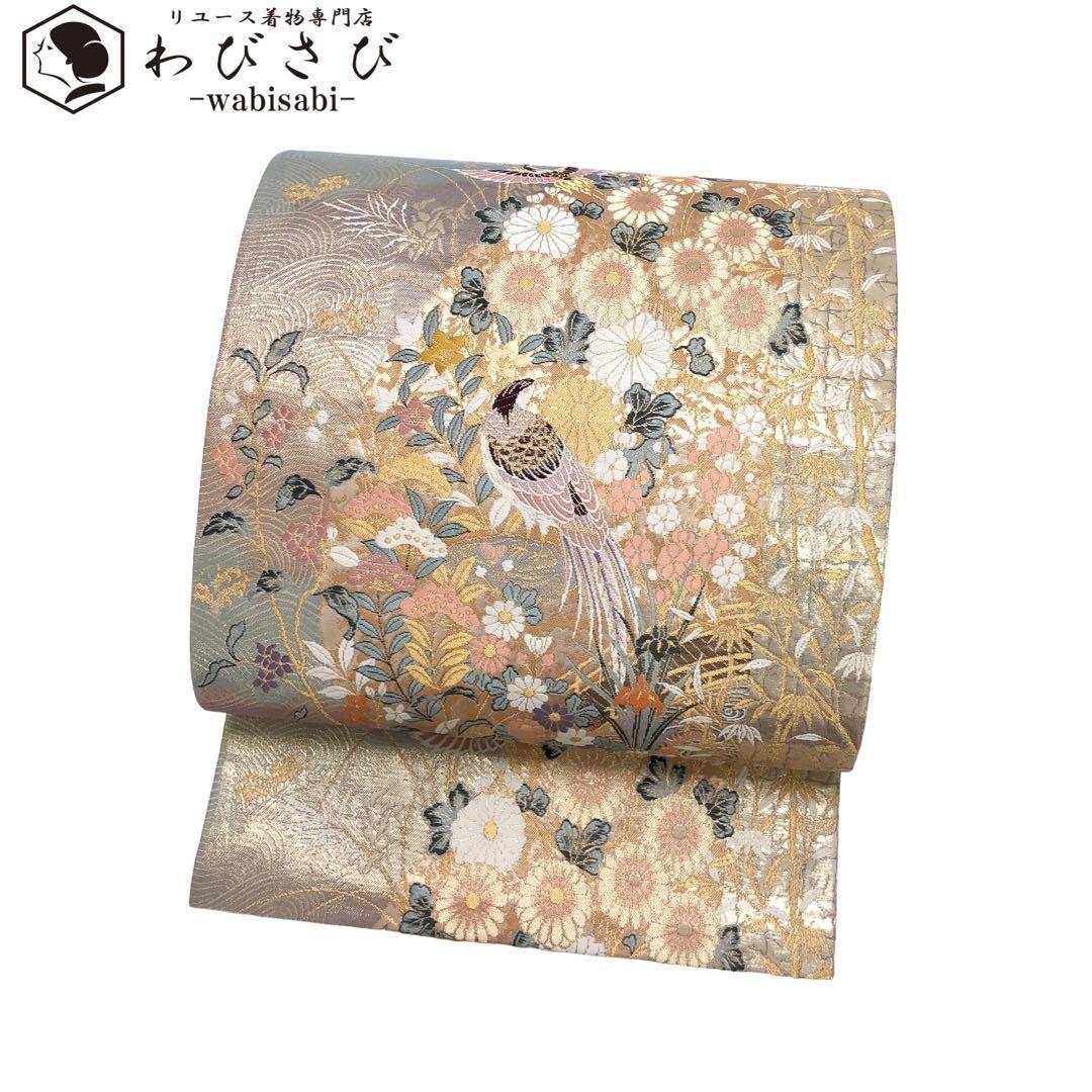 - 袋帯 九百本金弐重織 献上波花鳥 季節の美しい花模様に鳥 金糸 O-3299