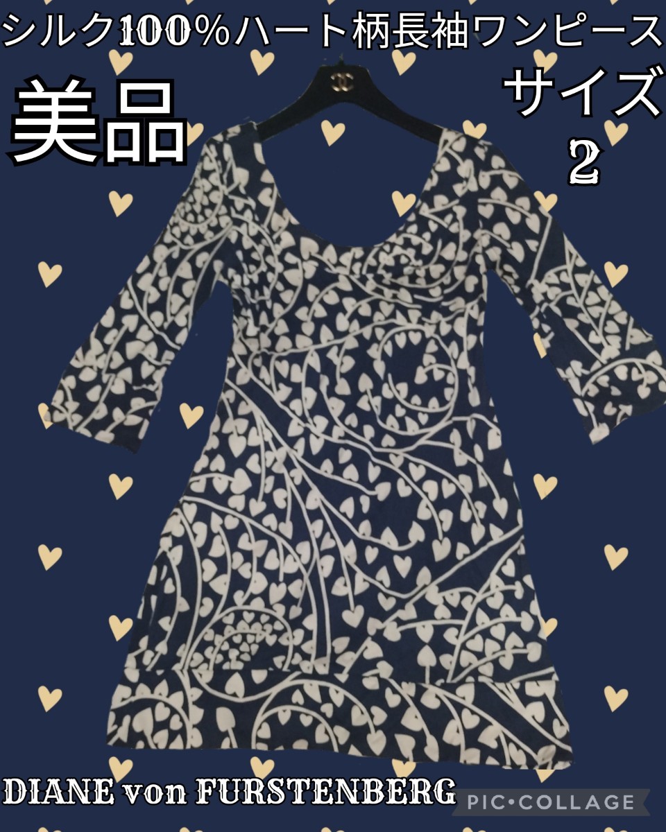 > 美品★DIANE von FURSTENBERG★ワンピース★ひざ丈★シルク★紺★ハート★ネイビー★総柄★ダイアンフォンファステンバーグ★長袖★DVF