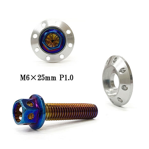 > M6 25mm フランジボルト P1.0 座面枠 20×4mm アルミ カラーワッシャー デザイン フジツボ 車 バイク ドレスアップ 焼きチタン×シルバー