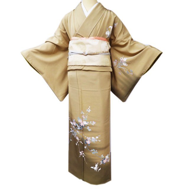 - 付下げ 付け下げ 訪問着 着物 中古 正絹 袷 フォーマル 紋付 花の図 薄茶色 多色 身丈156cm 裄67cm M きもの北條 A982-1