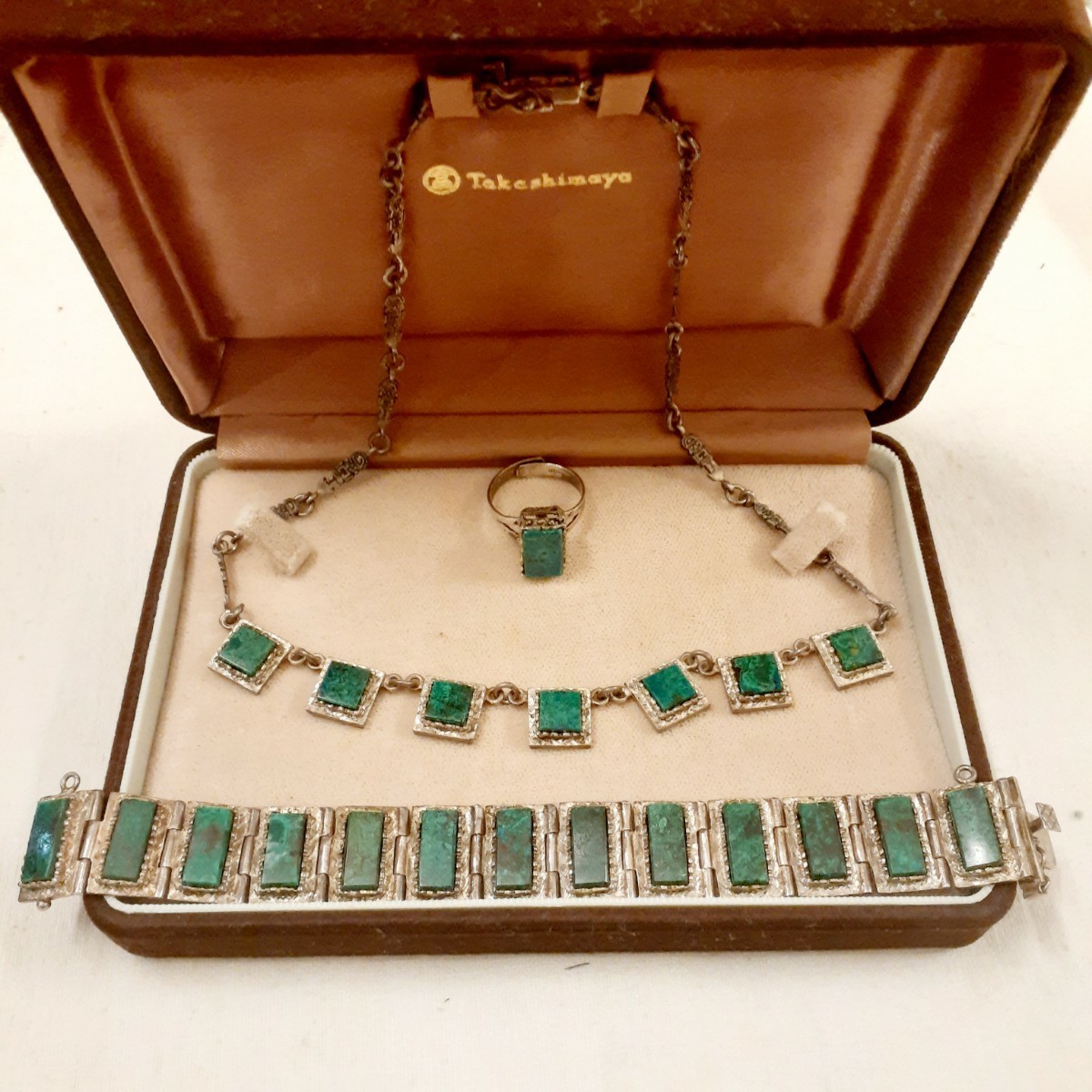 - マラカイト 彫金 ネックレス ブレスレット 指輪 925刻印 約66.15g アンティーク